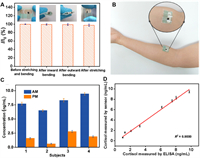 | Fig. 7. (A) Relative DPV responses after 10 such repeated bending tests in PBS (0.2 mol/L, pH 7.0) involving inward bending, outward bending and stretching. (B) The image of CPE on human arm. (C) Cortisol levels in sweat in the AM and PM from four healthy subjects. (D) Correlation of cortisol concentration measured by ELISA and sensor. | |