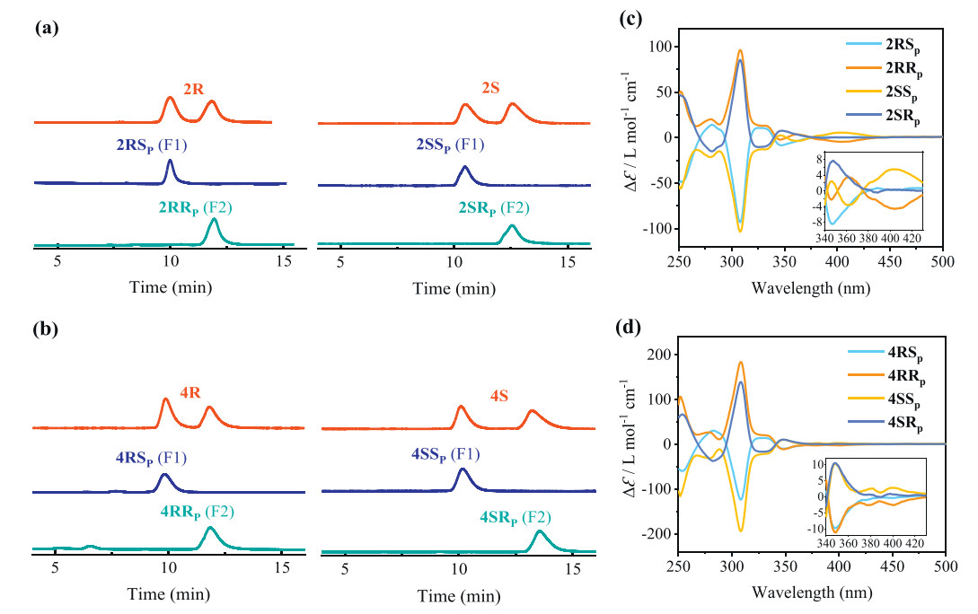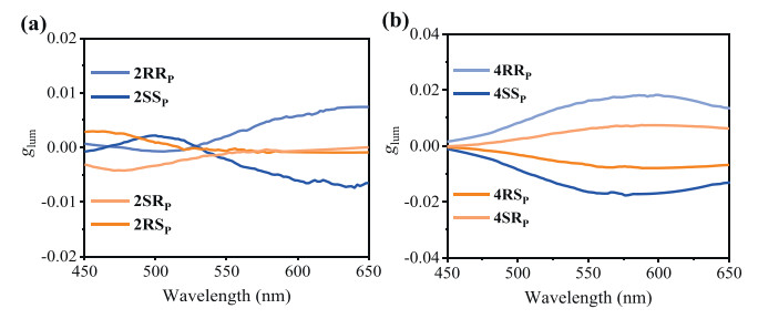 | Fig. 3. glum of 15 µmol/L (a) 2RRp, 2SSp, 2RSp and 2SRp and (b) 4RRp, 4SSp, 4RSp and 4SRp measured in CHCl3. | |