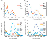| Fig. 1. (a) UV–vis spectra of 2R, 4R, 2MR and 4MR (10 µmol/L) in CHCl3. (b) Normalized fluorescence spectra of 2R, 4R, 2MR and 4MR (1 µmol/L) in CHCl3 (λex = 355 nm). Normalized fluorescence spectra of (c) 2R and (d) 4R (10 µmol/L) in various solvents (λex = 355 nm). | |