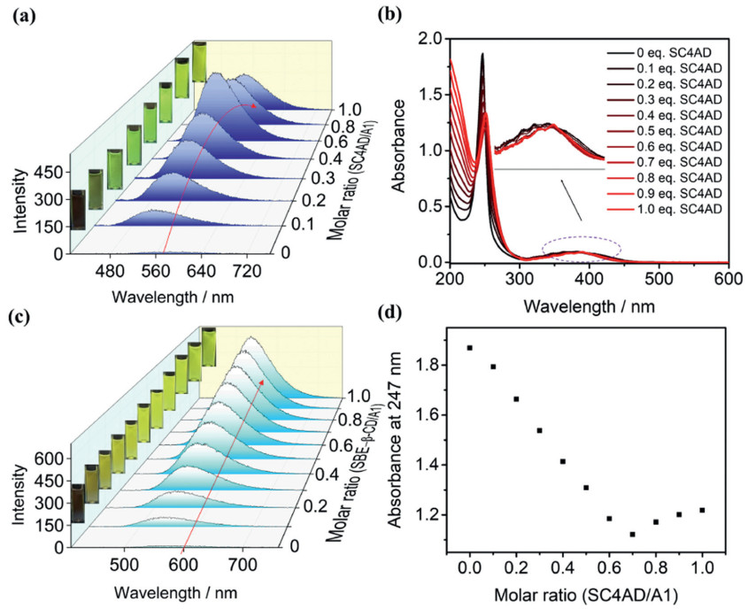 | Fig. 1. Fluorescence spectra of A1 with adding different ratios of (a) SC4AD and (c) SBE-β-CD ([A1] = 2 × 10–5 mol/L, λex = 392 nm, ex/em slits: 5 nm/5 nm); UV–vis absorption spectra and characteristic absorbance at 247 nm of guest A1 with adding various molar ratio of (b, d) SC4AD ([A1] = 2 × 10–5 mol/L). | |