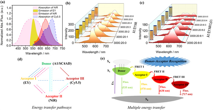 | Fig. 3. (a) Normalized absorption and emission spectra of EY, NiR, and Cy5.5. (b) Fluorescence spectra of A1/SC4AD+EY with gradually adding NiR (λex = 392 nm, ex/em slits: 5 nm/5 nm, [A1] = 2 × 10–5 mol/L, [SC4AD] = 5 × 10–6 mol/L, [EY] = 1.3 × 10–7 mol/L, inset: photographs under 365 nm portable UV light). (c) Fluorescence spectra of A1/SC4AD+EY+NiR with gradually adding Cy5.5 (λex = 392 nm, ex/em slits: 5 nm/5 nm, [A1] = 2 × 10–5 mol/L, [SC4AD] = 5 × 10–6 mol/L, [EY] = 1.3 × 10–7 mol/L, [NiR] = 5.3 × 10–8 mol/L, inset: photographs under 365 nm portable UV light). (d) Multipath FRET with A1/SC4AD as donor and various dyes as acceptors. (e) Change in energy level during three-step FRET process. | |