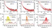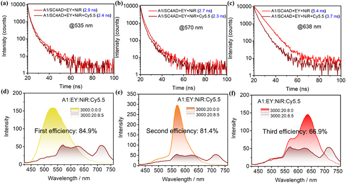 | Fig. 4. The time-resolved photoluminescence decay spectra of A1/SC4AD+EY+NiR before and after adding the third acceptor Cy5.5 at (a) 535 nm, (b) 570 nm, and (c) 638 nm. (d-f) The energy transfer efficiency in the three-step FRET system A1/SC4AD+EY+NiR+Cy5.5. [A1] = 2 × 10–5 mol/L, [SC4AD] = 5 × 10–6 mol/L, [EY] = 1.3 × 10–7 mol/L, [NiR] = 5.3 × 10–8 mol/L, [Cy5.5] = 3.3 × 10–8 mol/L. | |
