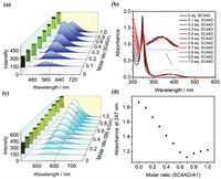 Molecule A1 was synthesized and characterized by nuclear magnetic resonance (NMR) spectra and high resolution mass spectra (Scheme S1, Figs. S1–S5 in Supporting information). As revealed by UV–vis absorption spectra and fluorescence spectra, A1 had two characteristic absorption bands, located at 247 nm and 392 nm, respectively, and the emission was almost invisible in aqueous solution (Figs. S6a and b in Supporting information). After introducing poor solvent dimethyl sulfoxide, intermolecular aggregation was formed, and the fluorescence at 560 nm was induced and enhanced gradually (Figs. S6c and d in Supporting information), demonstrating its property of aggregation-induced emission (AIE). To promote robust aqueous fluorescence, various negatively charged macrocyclic host, including amphiphilic SC4AD containing long hydrophobic alkyl chains and SBE-β-CD, were selected to assemble with the guest A1. According to Figs. 1a and c, the faint fluorescence of A1 was likely enhanced with increasing the molar ratio of SC4AD or SBE-β-CD. Distinctly, the fluorescence based on macrocyclic host was located at 535 nm. The obvious blue shift meant that the bright emissions induced by macrocyclic hosts originated from single molecule A1, but not from intermolecular aggregation of A1.