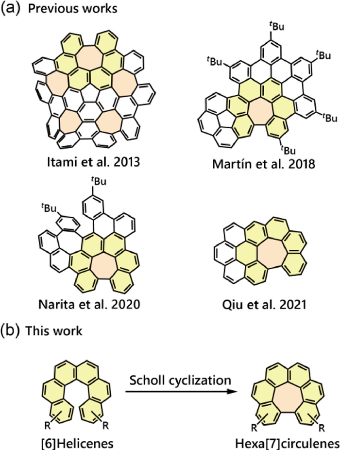 | Fig. 1. (a) Nanographenes containing hexa[7]circulene synthesized from [6]helicene by Scholl cyclization. (b) Study of Scholl cyclization for substituted [6]helicenes in this work. | |