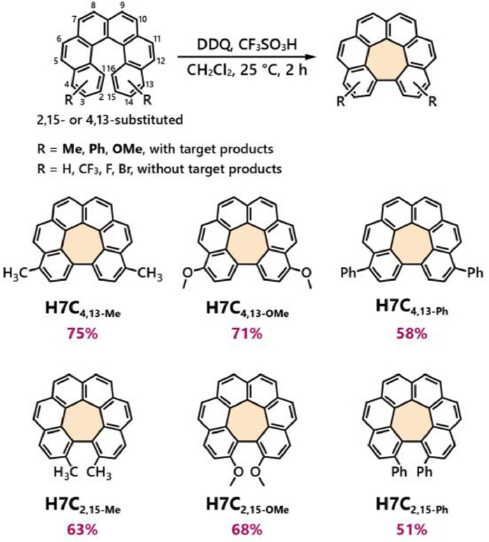 All [6]helicene precursors, including 2,15-bis-substituted and 4,13-bis-substituted derivatives, were synthesized through the photocyclization method starting from bis-vinyl-substituted naphthalenes. These precursors are designated as 6H2,15−Me (featuring methyl groups at positions 2 and 15), 6H2,15-OMe, 6H2,15-Ph, 6H2,15-Br, 6H2,15-F, 6Hnull and their analogues 6H4,13−Me, 6H4,13-OMe, 6H4,13-Ph, 6H4,13-Br, 6H4,13-F and 6Hnull. Then, we commenced our investigation into the Scholl cyclization from the less crowded 4,13-substituted [6]helicene derivatives. The reaction was conducted in CH2Cl2 solution using 1.2 equiv. of 2,3-dichloro-5,6-dicyano-1,4-benzoquinone (DDQ) as the oxidant, along with an excessive amount of CF3SO3H to ensure a strongly acidic environment. The reaction was taken under argon with stirring for 2 h at 25 ℃. Among the six 4,13-substituted precursors tested, 6H4,13-Me, 6H4,13-OMe and 6H4,13-Ph successfully yielded the target products H7C4,13-Me, H7C4,13-OMe and H7C4,13-Ph with the yields of 75%, 71% and 58%, respectively (Fig. 2) with removal of two hydrogen atoms according to both NMR and mass analysis. By changing the acid from CF3SO3H to CH3SO3H or CF3COOH, the Scholl reaction still gave negative results. On the contrary, 6H4,13-Br, 6H4,13-F and 6Hnull, gave no target products with employing either CF3SO3H, CH3SO3H or CF3COOH, and thin-layer chromatography (TLC) analysis indicated the formation of inseparable side-products (Tables S1 and S2 in Supporting information).