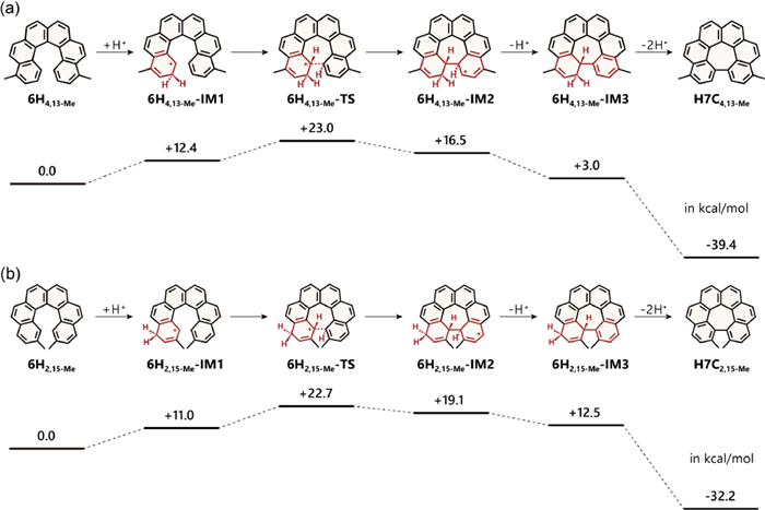 The aforementioned results suggested that substituents might significantly impact the reactivity. We hypothesized that electron-donating groups might facilitate the Scholl cyclization process, whereas electron-withdrawing groups might hinder it. To elucidate the underlying mechanism, DFT theoretical calculations were conducted. According to the Scholl mechanism, two plausible ways (the radical cation pathway and the arenium cation pathway) could be raised for this cyclization [31,32]. We firstly investigated the radical cation pathway. However, we were unable to construct the cyclized intermediates in most cases (only 6H4,13-Ph could form the cyclized intermediate), suggesting this pathway might not be suitable. Therefore, we shifted to the arenium cation pathway and successfully mapped out the reaction path for all helicenes (Figs. S63-S73 in Supporting information). Taking 6H4,13−Me as an illustrative example (Fig. 3a), the reaction commenced with a protonation at position 2 of 6H4,13−Me to form intermediate 6H4,13−Me-IM1, leading to an increase in free energy (ΔG) of 12.4 kcal/mol. Subsequently, it proceeded through a cyclization step with an activation barrier (ΔG‡) of 23.0 kcal/mol measured from the starting point, yielding the cyclized intermediate 6H4,13−Me-IM2. Following this, deprotonation and dehydrogenation reactions finally gave the product H7C4,13−Me with a total free energy release of 39.4 kcal/mol. With the change of the substituents to other electron-donating groups, helicenes 6H4,13-OMe and 6H4,13-Ph exhibited the initial protonation step with the energy increase of 12.8 and 13.5 kcal/mol, respectively, and the cyclization activation barriers were revealed to be 19.5 and 24.8 kcal/mol, respectively. For comparison, the unsubstituted 6H demonstrated similar initial protonation free energy as 13.3 kcal/mol at ortho-position or 12.0 kcal/mol at para-position, but a higher cyclization activation barrier of 25.8 or 26.8 kcal/mol. On the other hand, the electron-withdrawing groups brought higher protonation energies ranging from 16.9 to 18.5 kcal/mol, and activation barriers from 27.0 to 33.9 kcal/mol, which might be unfavorable for Scholl cyclization. These findings supported our hypothesis that electron-donating groups stabilize the cyclization transition state, thereby facilitating the Scholl cyclization.
