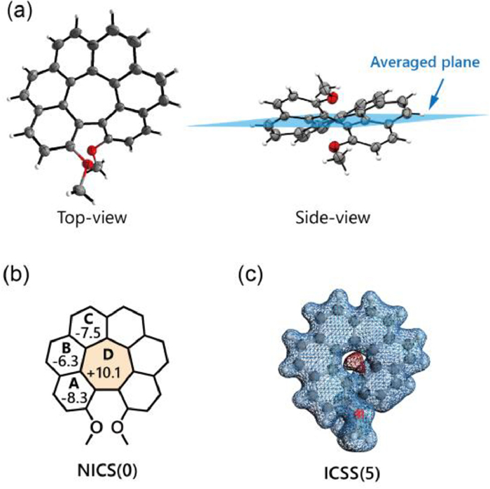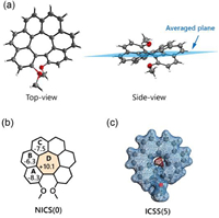 | Fig. 4. (a) Single-crystal structure of H7C2,15-OMe. (b) NICS(0) of H7C2,15-OMe. Due to the symmetry, only half of the molecules were shown. (c) ICSS analysis of H7C2,15-OMe (the numbers in parentheses refer to the absolute value of the ICSS isovalue; blue and red colors represent magnetically shielding and de-shielding areas, respectively). | |