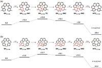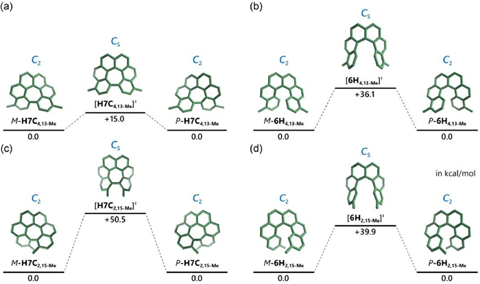 | Fig. 5. Enantiomerization process between P- and M-isomers of (a) H7C4,13−Me, (b) 6H4,13−Me, (c) H7C2,15−Me and (d) 6H2,15−Me. Calculations were performed in the PBE0-D3(BJ)/ma-def2-TZVPP//PBE0-D3(BJ)/def-TZVP level of theory, and the Gibbs free energies are given in kcal/mol. | |