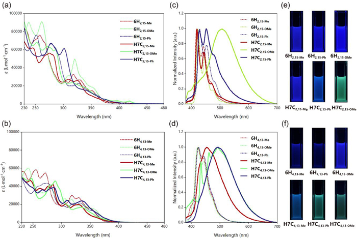 | Fig. 6. UV–vis spectra of (a) 2,15-substituted and (b) 4,13-substituted [6]helicenes and hexa[7]circulenes (c = 1 × 10–5 mol/L in CH2Cl2), fluorescence spectra of (c) 2,15-substituted and (d) 4,13-substituted [6]helicenes and hexa[7]circulenes (c = 3 × 10–5 mol/L in CH2Cl2, λex = 360 nm), and their photographs (e) and (f) under irradiation of 365 nm. | |