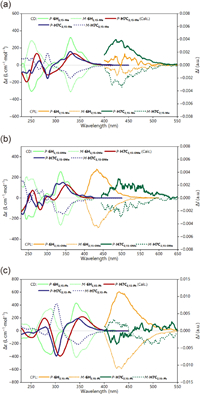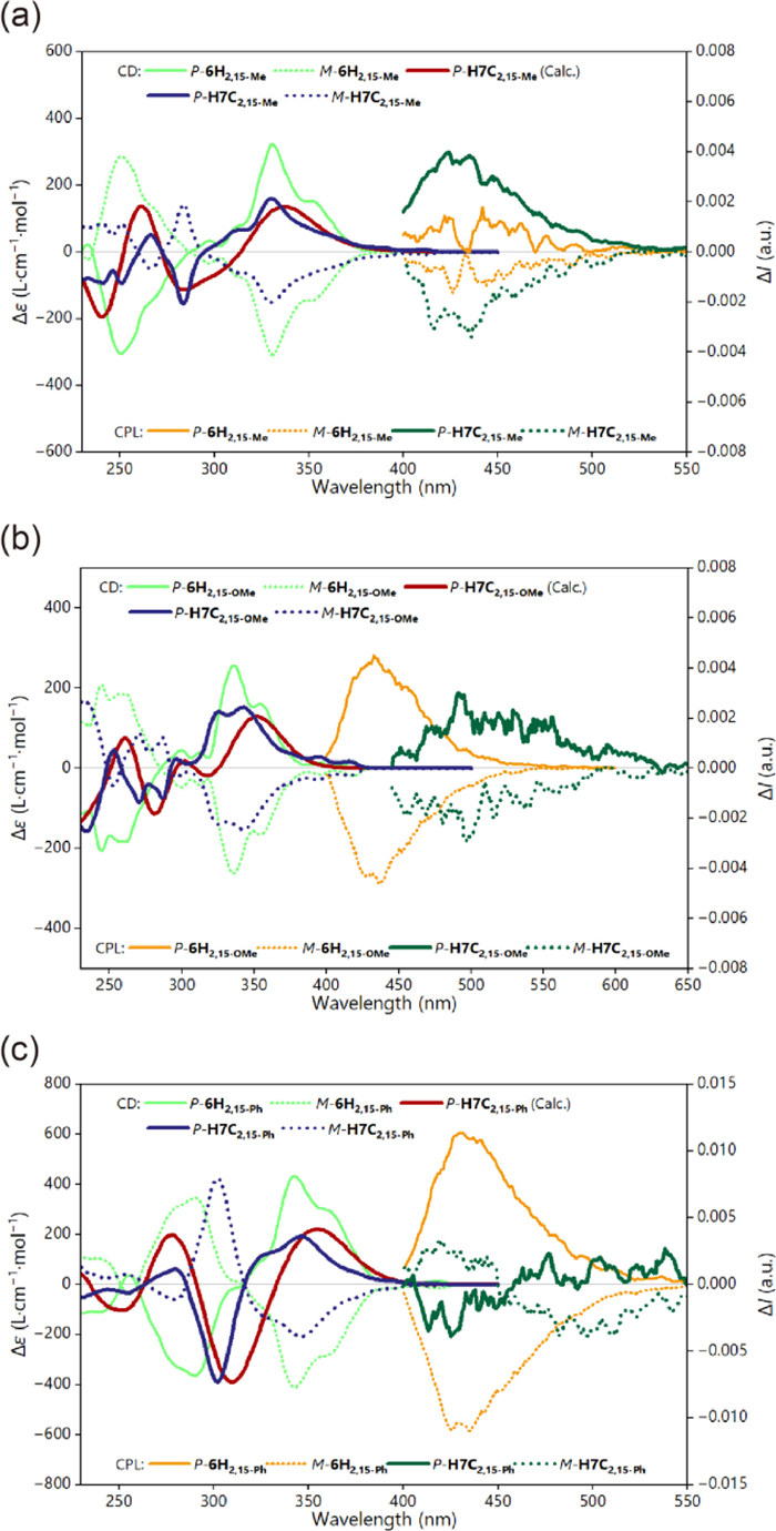 | Fig. 7. Experimental and calculated ECD spectra (left, c = 1 × 10–5 mol/L in CH2Cl2), and CPL spectra (right, c = 1 × 10–5 mol/L in CH2Cl2) of (a) 6H2,15−Me and H7C2,15−Me, (b) 6H2,15-OMe and H7C2,15-OMe, and (c) 6H2,15-Ph and H7C2,15-Ph. Theoretical calculations were performed at the PBE0-D3(BJ)/def-TZVP level of theory. | |