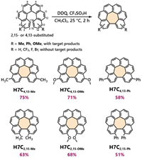 | Fig. 2. Scope of Scholl cyclization of a series substituted helicenes. Separation yields are listed in purple. | |
