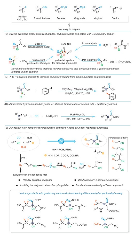 In summary, we have achieved a five-component carbonylative transformation with good functional group tolerance and excellent chemoselectivity, which converts abundant acrylonitrile, carbon monoxide, fluoroalkyl halides, and nucleophiles to value-added carboxylic acid derivatives with α-quaternary carbon center. The synthetic utilities were demonstrated by the various transformations of the products into medicinal interest fluorine-containing compounds with α-quaternary carbon center. We believe that this interesting protocol can find potential applications in drug development.