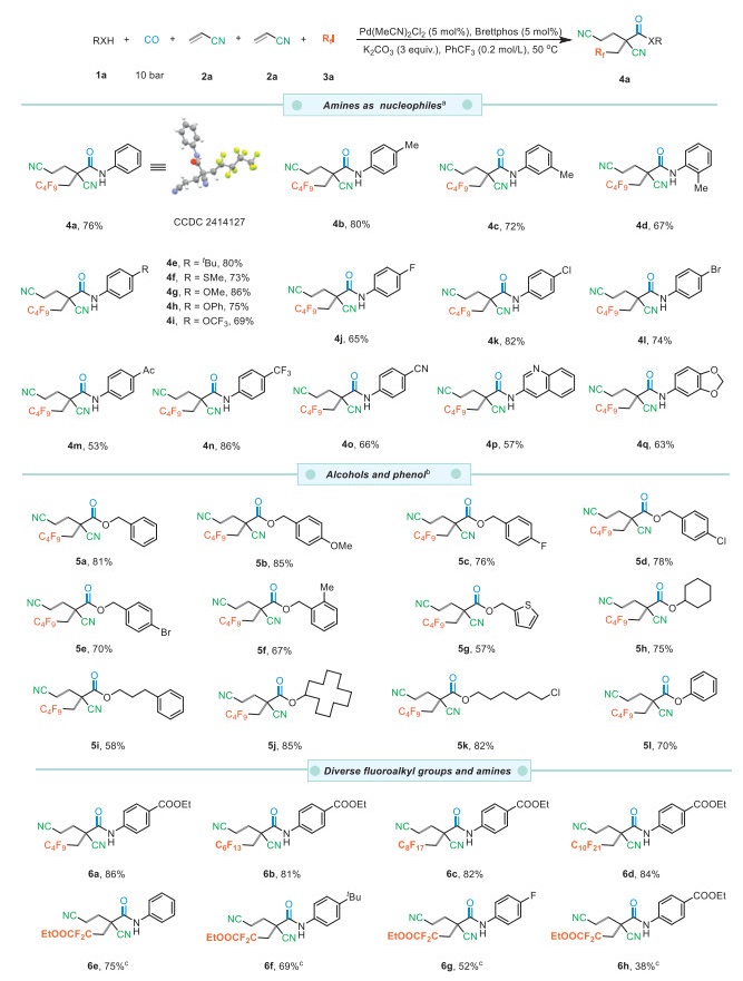 | Scheme 2. Scope of the amides, alcohols and fluoroalkyl halides. a Amines (0.3 mmol), 2a (2.5 equiv.), 3a (1.2 equiv.), Pd(MeCN)2Cl2 (5 mol%), Brettphos (5 mol%), K2CO3 (3 equiv.), CO (10 bar), PhCF3 (1.5 mL) stirred at 50 ℃ for 24 h, isolated yield. b Alcohols or phenols (0.3 mmol), 2a (2.5 equiv.), Pd(PPh3)4 (5 mol%), Xantphos (5 mol%), K2CO3 (3 equiv.), CO (10 bar), PhCF3 (1.5 mL) stirred at 50 ℃ for 24 h, isolated yield. c Amines (0.2 mmol), 2a (3 equiv.), ethyl iododifluoroacetate (1.5 equiv.), Pd(MeCN)2Cl2 (10 mol%), tri-p-anisylphosphine (20 mol%), K2CO3 (3 equiv.), CO (10 bar), PhCF3 (2 mL) stirred at 50 ℃ for 48 h, isolated yield. | |