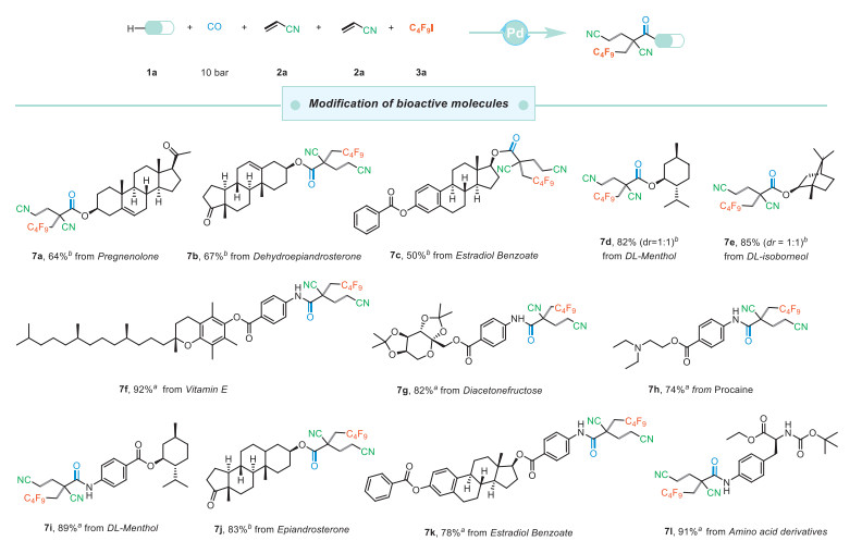To test the practicality of this five-component carbonylative procedure, diverse drug molecules and natural products modified anilines were also investigated (Scheme 3). To our delight, anilines bearing pregnenolone, dehydroepiandrosterone, estradiol benzoate, DL-menthol, DL-isoborneol, vitamin E, diacetonefructose, procaine, epiandrosterone, and amino acid derivatives were all converted to the target compounds smoothly and give the desired products 7a-7l in 50%−92% yields.