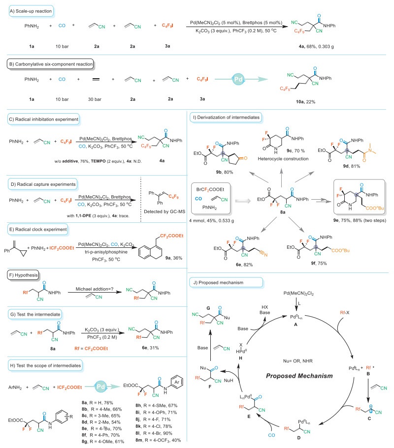 Based on the above reaction results and literature studies [50–70], we proposed a reasonable reaction mechanism (Scheme 4J). Initially, active catalyst Pd0Ln species A was produced from the Pd(MeCN)2Cl2 pre-catalyst. Then, the Pd0Ln complex induced a SET (single-electron transfer) process of fluoroalkyl halides to yield the corresponding radical B and a PdILnX species, followed by the addition of the radical B to acrylonitrile to afford a secondary radical C. Next, the PdILnX species was reincorporated with the C to get the intermediate D. After the insertion of carbon monoxide, complex D can be transformed into intermediate E. Later on, intermediate E reacts with nucleophiles to give the desired intermediate F and it also can be a good partner to react with Michael acceptor to prepare diverse products G with α-quaternary carbon. Meanwhile, palladium-hydride complex H can be yielded and converted to Pd0Ln species A in the presence of base for the next catalytic transformation.