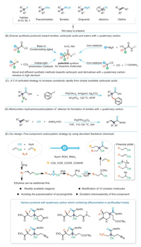 Aliphatic amides, esters, and acids bearing α-quaternary carbon are a promising and valuable class of chemicals for potential bioactive molecules, such as Caramiphen, Dalcetrapib, Loperamide, Fenhexamid [30–33]. Traditional synthetic methods toward these compounds were the condensation reaction of carboxylic acid or nucleophilic attack of acyl halide [34,35]. Recently, for the synthesis of aforementioned valuable chemicals, visible-light photoredox-catalyzed carboxylation of tertiary C(sp3)-H [36,37], iron-catalyzed C(sp3)-C(sp3) coupling [38] and carbonylation of tertiary halides by iron catalysis [39,40] provide novel and elegant disconnection approaches from the perspective of retrosynthesis analysis (Scheme 1B). However, the raw materials of most of these methods were not readily available. As a result, the development of novel C—C bond-forming methodologies to amides and esters with α-quaternary carbon from abundant reagents remained in high demand.