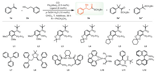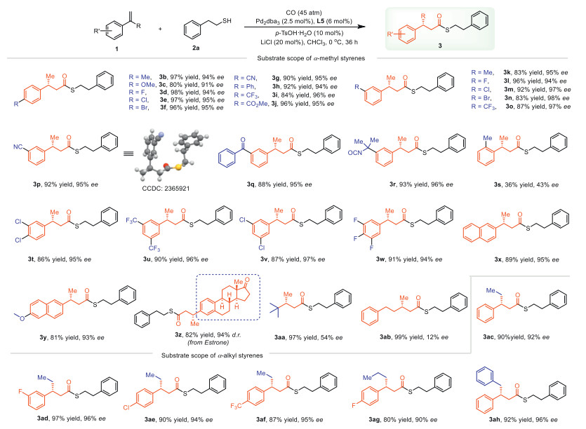| Scheme 2. Reaction conditions: α-alkyl styrenes 1 (0.2 mmol, 1.0 equiv.), 2-phenylethanethiol 2a (0.3 mmol, 1.5 equiv.), CO (45 atm), Pd2dba3 (2.5 mol%), L5 (6 mol%), p-TsOH·H2O (10 mol%) and LiCl (20 mol%) in 0.5 mL of CHCl3 at 0 ℃ for 36 h. Isolated yields were given. ee values were determined by chiral-phase HPLC analysis. | |