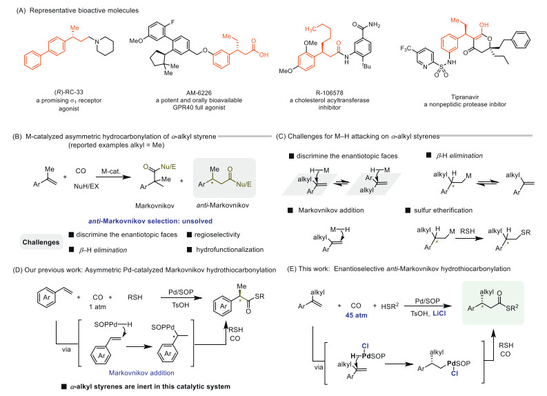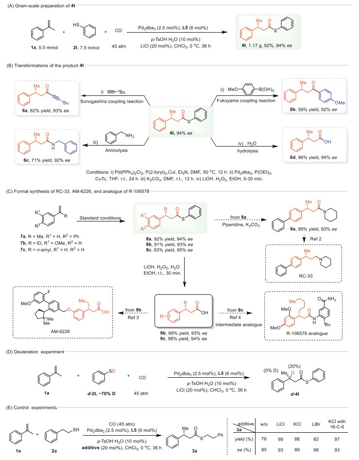 In summary, we developed a unique SOP/Pd-catalyzed system for the regioselective and enantioselective intermolecular hydrothiocarbonylation of α-alkyl styrenes, a transformation not readily accessible in previous studies. The distinctive SOP ligand and the LiCl additive were crucial to this success. The reaction demonstrated high regioselectivity, exhibiting exclusively anti-Markovnikov selectivity, as well as good to excellent yields in most cases. It achieved excellent enantioselectivity, with values generally ranging from 90% to 98% enantiomeric excess (ee), and showed broad functional group tolerance and substrate scope, encompassing 68 examples. Furthermore, the resulting products can be converted into various β-chiral 3-aryl alkanoic acid derivatives. This protocol may also be applied to the formal synthesis of medically significant bioactive molecules, including RC-33 and AM-6226, as well as the intermediate analogue of R-106578.
