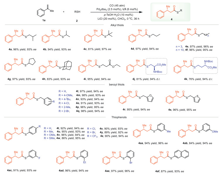 | Scheme 3. Reaction conditions: α-alkyl styrenes 1a (0.2 mmol, 1.0 equiv.), RSH 2 (0.3 mmol, 1.5 equiv.), CO (45 atm), Pd2dba3 (2.5 mol%), L5 (6 mol%), p-TsOH·H2O (10 mol%) and LiCl (20 mol%) in 0.5 mL of CHCl3 at 0 ℃ for 36 h. Isolated yields were given. ee values were determined by chiral-phase HPLC analysis. | |