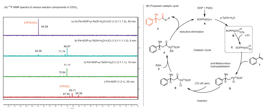 Subsequently, 31P NMR studies were performed to monitor the relative Pd species, particularly, active Pd–H species (in this work, we have also tried explorations including 1H NMR and HRMS analysis or crystal growing of Pd species, yet all attempts were unsuccessful). As shown in Scheme 5A, first, mixing SOP (L1) with Pd2dba3 in CDCl3 for 30 min provided SOPPd complex [Three new peaks emerged: δ = 65.71 (major) and 67.94 (minor), 60.26 (minor); experiment i]. Then, p-TsOH.H2O (1.1 equiv.) was added to the above mixture and another two new peaks at δ = 70.17 (major, TsO–PdII–H species) [59] and 72.84 (minor) were afforded through oxidative addition (experiment ii). Sequentially addition of LiCl (2 equiv.) was executed (experiment iii), quickly two new peaks appeared at δ = 69.97 (major) and 71.74 (minor), which were assigned to Cl–PdII–H intermediate. In addition, we speculate that OTs− as weakly associated counterion could be easily replaced by Cl− anion. After additional 30 min stirring, Cl–PdII–H intermediate were completely transformed to Cl–PdII–Cl species (δ = 94.58, this species were observed in experiment iii too), which were determined by comparison with 31P NMR of the complex generated from SOP and Pd(PhCN)2Cl2 (experiment iv). Whereas in the presence of Cl–PdII–Cl species, hydrothiocarbonylation does not work under the standard conditions (For details see Supporting information). In sum, the above experimental results indicate that in the presence of LiCl, TsO–PdII–H species, generated in situ by the oxidative addition of the SOPPd complex with p-TsOH, is easily converted to true active intermediate (Cl–PdII–H) by ligand exchange with Cl− anion. Besides, without starting materials (α-alkyl styrene and CO), excess amount of LiCl, drives the generation of the Cl–PdII–Cl species, thereby inhibiting the reaction.