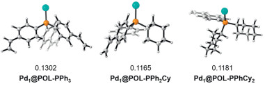 We also found similar results detected by X-ray photoelectron spectroscopy (XPS) of three new single-atom catalysts. Through the analysis of P 2p orbitals (Figs. 2a-c), a smaller signal peak appeared at 130.31, 130.20 and 130.13 eV, respectively, corresponding to the signal peak of P coordinated with palladium. Meanwhile, these new peaks apart from the main high peaks reveals again the successful coordination of Pd single atoms, and each phosphine atom were slightly reduced, indicating oxidation states of Pd atoms which was consist with the XANES results. The binding energies of Pd 3d5/2 orbitals (Figs. 2d-f) are 337.19, 336.78 and 337.08 eV, respectively, which generally showed a decreasing trend due to the enhanced electron-donating ability of the ligand and increases slightly when the ligand contains two cyclohexyl groups. This trend is consistent with our calculated Pd charge change results, which again verifies the relationship between ligand and metal center and substrate interaction.
