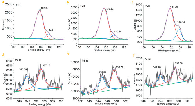 | Fig. 2. P 2p XPS spectra of (a) Pd1@POL-PPh3, (b) Pd1@POL-PPh2Cy, and (c) Pd1@POL-PPhCy2. Pd 3d XPS spectra of (d) Pd1@POL-PPh3, (e) Pd1@POL-PPh2Cy and (f) Pd1@POL-PPhCy2. | |