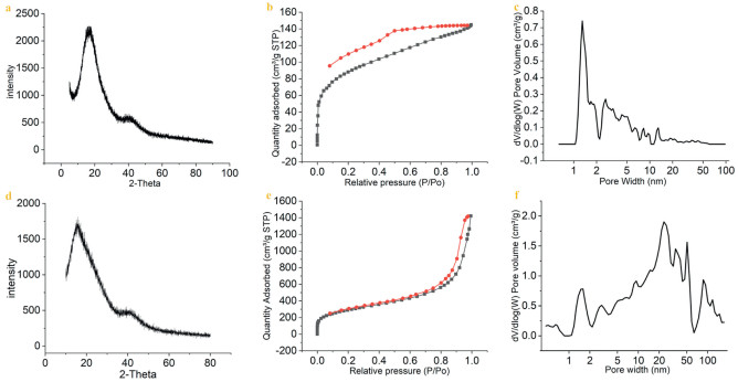 | Fig. 3. (a) XRD of Pd1@POL-PPh2Cy. (b) Nitrogen adsorption-desorption curve of Pd1@POL-PPh2Cy. (c) Pore size distribution of Pd1@POL-PPh2Cy. (d) XRD of Pd1@POL-PPh3. (e) N2 adsorption-desorption curve of Pd1@POL-PPh3. (f) Pore size distribution of Pd1@POL-PPh3. | |
