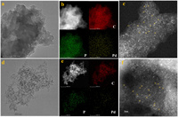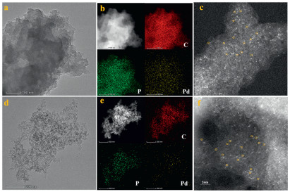 | Fig. 4. (a) HR-TEM image, (b) EDS-Mapping, (c) AC—HAADF-STEM of Pd1@POL-PPh2Cy. (d) HR-TEM image, (e) EDS-Mapping, (f) AC—HAADF-STEM of Pd1@POL-PPh3. | |
