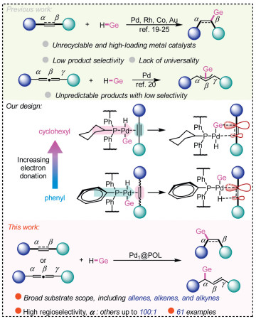 By directly introducing the cyclohexyl group into the phosphine ligand skeleton, we prepared an electrically tunable porous organic ligand polymer, and subsequently loaded the metal to obtain the corresponding palladium single atom catalysts Pd1@POL-PPhnCym (n + m = 3). Based on the soft-hard acid-base theory, the obtained palladium single-atom catalyst processed oxidative addition to form H-Ge-Pd species, and efficiently bonded to substrates with unsaturated C—C bonds of corresponding electrical properties, and further forms a quaternary ring transition state to complete the addition reaction of substrates such as alkynes, alkenes and allenes. The charge calculation and XPS characterization of the catalyst palladium center demonstrated the electrical regulation of the ligand skeleton on the catalytic center metal palladium and supplemented by density functional theory to explain the mechanism of the selectivity of hydrogermylation addition process of unsaturated C—C bonds.