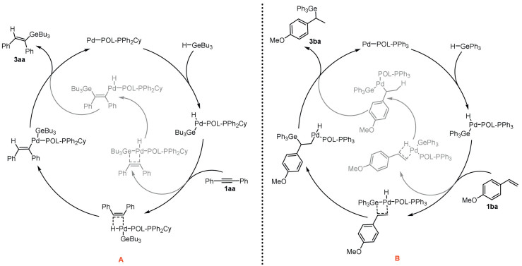 | Scheme 3. Proposed mechanism for hydrogermylation of (A) alkynes and (B) alkenes. | |