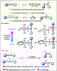 Similarly, in metal-catalyzed selective reactions, ligands play a crucial role in regulating the electrical properties of metal centers and controlling the spatial effects of catalysts, thereby identifying substrates, and regulating product configurations [50–56]. As the more π orbitals overlap, the density of the electron cloud increases, while correspondingly, the electron binding force increases and the ability to give electrons decreases. Therefore, adjusting the electrical properties of the catalyst is crucial for enhancing its affinity to the substrates. Based on this, development of new metal-ligand catalytic system through reasonable regulation of the electrical properties of ligand skeletons may achieve high selectivity conversion in hydrogermylation of various substrates with unsaturated C—C bonds.