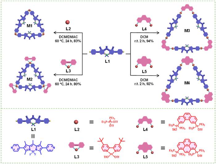 | Fig. 1. Schematic illustration of the coordination-driven self-assembly of triangular metallacycles M1–M4 and the chemical structures of building blocks L1–L5. | |