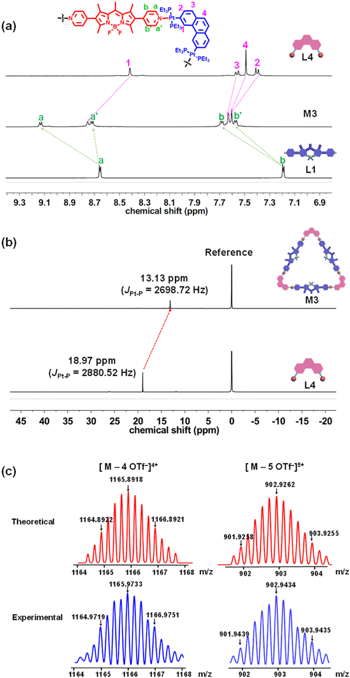 | Fig. 2. (a) The partial 1H NMR spectra (500 MHz, CD2Cl2, 298 K) of the ligand L4 (up), the self-assembled metallacycle M3 (middle) and ligand L1 (bottom). (b) The 31P NMR spectra (202 MHz, CD2Cl2, 298 K) of metallacycle M3 (up) and ligand L4 (bottom). (c) Theoretical (top) and experimental (bottom) ESI-TOF-MS of metallacycle M3. | |