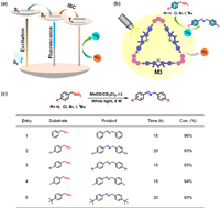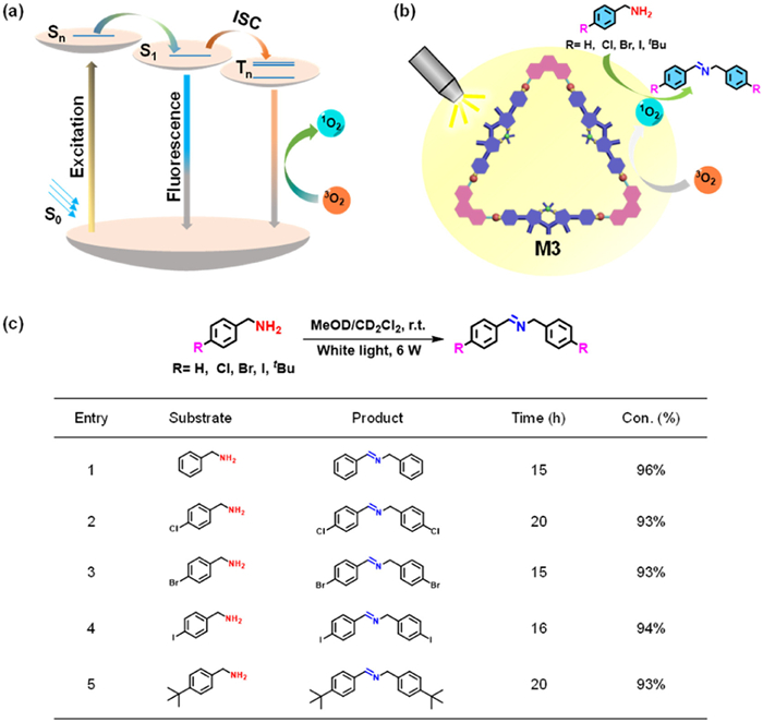 | Fig. 5. (a) Working mechanism of PSs M3. (b) Generation of 1O2 and the photooxidation reaction of M3. (c) Visible-light-driven oxidative coupling of various amines to imines catalyzed by M3 (reaction conditions: amine (0.1 mmol), catalyst M3 (2.0 mol%), MeOD/CD2Cl2 (800 µL, v/v = 2/1), air, white light (6 W). Conversion rate was determined in situ by 1H NMR). | |