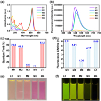 | Fig. 3. Absorption spectra (a) and emission spectra (b) of metallacycles M1–M4 (5 µmol/L) and ligand L1 (15 µmol/L) in dichloromethane. Comparison of quantum yields (c) and fluorescence lifetimes (d) of metallacycles M1–M4 (5 µmol/L) and ligand L1 (15 µmol/L) in dichloromethane. Photographs of L1 (15 µmol/L) and metallacycles M1–M4 (5 µmol/L) in natural light (e) and 365 nm (f) in dichloromethane. | |