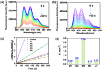 | Fig. 4. Emission spectra of DMA in dichloromethane in the presence of (a) L1 (3 µmol/L) and (b) M3 (1 µmol/L). (c) The decomposition of DMA by L1, M1-M4. (d) The histogram of 1O2 generation rate of L1, M1–M4. | |