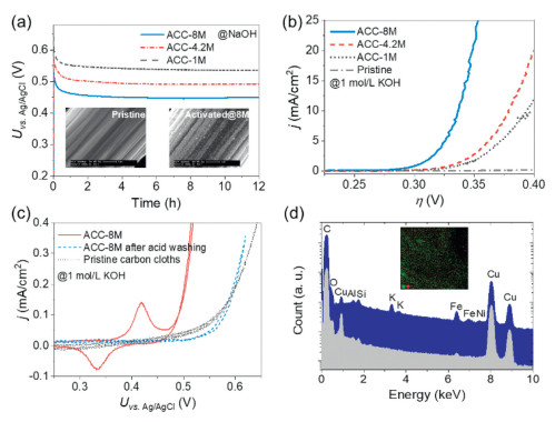 | Fig. 1. Electrochemical characterization of anodically activated carbon cloths and identification of the true catalytic active species of ACC-8M. (a) Anodic activation of carbon cloths in NaOH electrolytes of varying concentrations (8, 4.2, and 1 mol/L). The current density was set to 1 mA/cm2. Insets show SEM images of pristine carbon cloths and ACC-8M. (b) Linear sweep voltammetry (LSV) of anodically activated carbon cloths (ACC-8M, ACC-4.2M, and ACC-1M) in 1 mol/L KOH. Scan rate: 1 mV/s. (c) CV scans of ACC-8M before and after acid washing. The scan rate is 50 mV/s. (d) EDX spectra of ACC-8M. The inset shows the corresponding elemental mapping image. | |