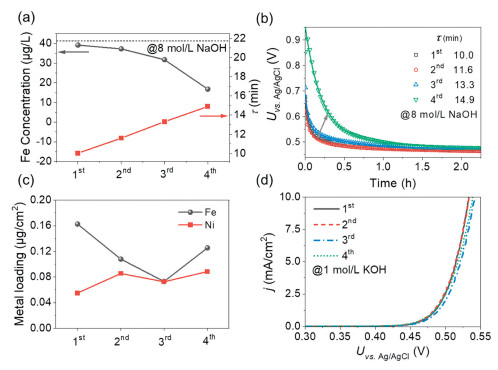 | Fig. 2. Dependence of anodic deposition on trace metal concentration in 8 mol/L NaOH. (a) Fe concentration in 8 mol/L NaOH (left y-axis) and the anodic deposition time constant (τ, right y-axis) during the sequential four-round anodic activation. Fe exhibits the most distinguishable ICP-MS signals (corresponding to the highest concentration) compared to other metals, and thus is used to represent the trace metal concentration. (b) Chronopotentiometric measurements during the sequential four-round anodic activation process. The curves are fitted with Eq. 1. The fitted data are shown as solid lines. (c) Metal loadings of ACC-8M during the sequential four-round anodic activation. (d) Polarization curves of ACC-8M after each round of the sequential anodic activation. Electrochemical measurements were conducted in 1 mol/L KOH. | |