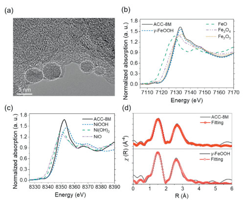 | Fig. 3. Microstructural analysis of trace metal oxyhydroxides on ACC-8M. (a) HRTEM image showing trace metal oxyhydroxides nanoparticles, marked by dashed circles. (b) XANES Fe K-edge spectra, with reference samples of γ-FeOOH, FeO, Fe3O4, and Fe2O3 included. (c) XANES of Ni K-edge spectra, with reference samples of NiOOH, Ni(OH)2, and NiO included. (d) EXAFS Fe K-edge R-space spectra. | |
