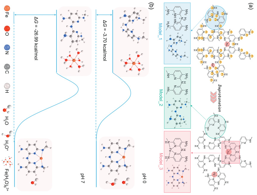 | Fig. 1. (a) The proposed deprotonation process and three local configurations represented as Model_1, Model_2, and Model_3. (b) The changes in Gibbs free energy of two different coordination reactions at pH 0 and 7, respectively. | |