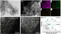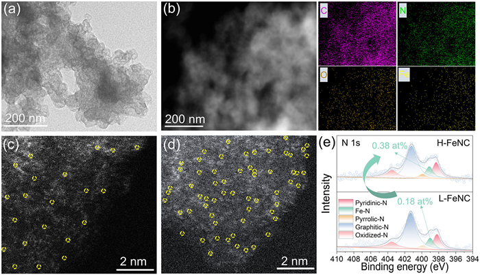 | Fig. 2. (a) TEM image, and (b) HAADF-STEM image and corresponding elemental mapping images of the H-FeNC catalyst. The high-resolution AC—HAADF-STEM images of (c) L-FeNC and (d) H-FeNC catalysts. (e) High-resolution XPS spectra of N 1s for H-FeNC and L-FeNC. | |