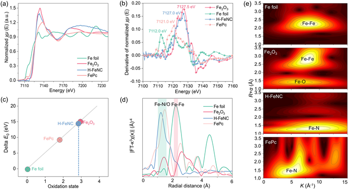 | Fig. 3. (a) Fe K-edge XANES spectra, (b) Fe K-edge derivative XANES spectra, (c) the corresponding average oxidation states of Fe center, (d) Fourier transform EXAFS spectra, and (e) wavelet transformed EXAFS contour plot for Fe foil, Fe2O3, H-FeNC, and FePc. | |