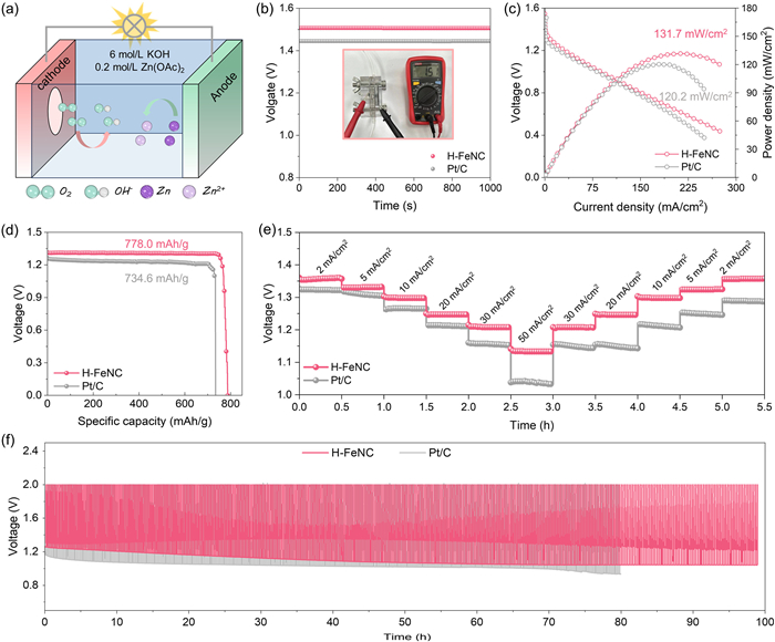 | Fig. 5. (a) Schematic diagram of a Zn–air battery. (b) Open-circuit voltages (inset shows a multimeter test of open-circuit voltage of H-FeNC catalyst. (c) Polarization curves and power density curves. (d) Discharge specific capacities at the current density of 10 mA/cm2. (e) Rate performance curves at different discharge current densities of Zn–air batteries with H-FeNC and Pt/C catalysts, respectively, and (f) cyclic stability test of H-FeNC and Pt/C-based Zn-air battery at 5 mA/cm2. | |