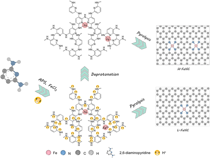 The high-temperature pyrolysis of cost-effective mixtures of N-containing compounds, Fe salts, and carbons has emerged as a popular solution for high-performance Fe-N-C catalysts [35-38]. Notably, significant advancements in electrocatalytic ORR performance have been achieved through the precise design of pyrolytic precursors, particularly by coating the Fe-dispersed N-containing polymers onto the surface of carbon black [39-44]. Compared to N-containing compounds such as organic molecules and macrocycles, these N-containing polymers offer significant advantages in the construction of Fe-N-C catalysts. They can effectively coordinate with metal atoms, enabling the precise engineering of highly active catalytic sites. Furthermore, their superior thermal stability facilitates the formation of high-density Fe-N4 active sites with enhanced chemical and electrochemical stability. For example, Wu et al. [39] reported that polyaniline (PANI) with the N-containing groups connected aromatic rings as a template compound could facilitate the high-density incorporation and uniform distribution of active sites. When intentionally combining the two precursors of PANI and cyanamide (CM), the CM as a pore former would result in a hierarchical pore structure to help anchor the Fe-N4 active sites [40]. Also, Sun and co-workers [41,42] selected poly(m-phenylenediamine) (PmPDA) with more nitrogen content and higher thermostability to further improve the ORR performance of Fe-N-C catalysts. Subsequently, Chen et al. [43,44] employed the N-rich 2,6-diaminopyridine (DAP) as a precursor to successfully prepare the Fe-N-C catalysts with densely accessible Fe-N4 active sites, expressing the outstanding ORR activity as cathode catalysts in Zn–air battery and proton exchange membrane fuel cell. Generally, in the synthetic process of N-containing polymers, the oxidative polymerization of monomer molecules is needed to proceed under acidic conditions. Given the N-functional groups as nucleophiles are easily protonated by binding with electrophilic hydrogen ions (H+), the acidic environment will result in competitive adsorption behavior between H+ and metal ions on N-functional groups. This phenomenon will not be conducive to the Fe-N coordination, severely restricting the high-density formation of Fe-N4 active sites [45-47]. Thermodynamically, the H+ can have a higher chemical affinity with N-groups than metal ions during the adsorption process, therefore H+ can be a strong competitor of metal ions [46]. Thus, it is critical to mitigate or eliminate the competitive adsorption of H+ to Fe ions for the achievement of high-density Fe-N4 active sites in the Fe-N-C catalysts.