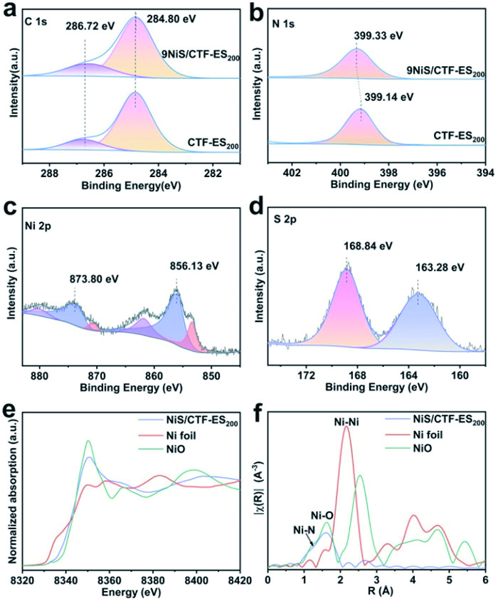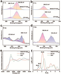 | Fig. 2. (a) C 1s XPS spectrum. (b) N 1s XPS spectrum. (c) Ni 2p XPS spectrum. (d) S 2p XPS spectrum. (e) Ni K-edge XANES. (f) Fourier-transformed EXAFS spectra for the Ni K-edge of the sample. | |