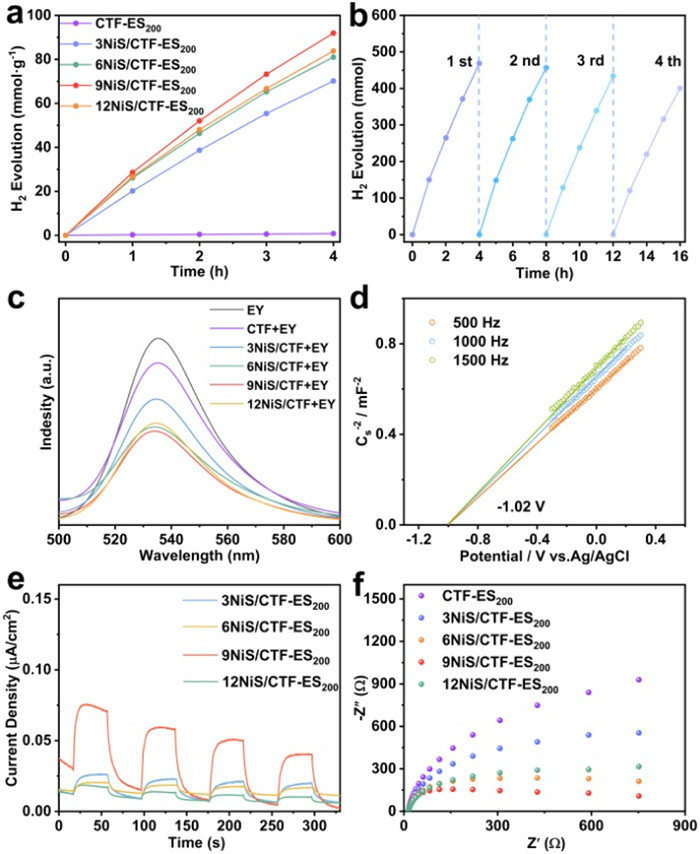 | Fig. 3. (a) Photocatalytic H2 evolution rates of the samples. (b) Photocatalytic H2 evolution of 9NiS/CTF-ES200 in four consecutive cycles. (c) Steady-state PL spectra with EY. (d) The Mott-Schottky test for 9NiS/CTF-ES200. (e) Transient photocurrent responses (under the Xenon lamp, λ > 420 nm) and (f) EIS curves of the electrodes. | |