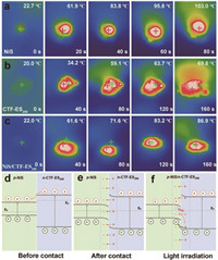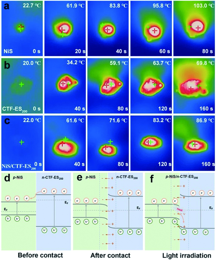 In addition, the photothermal effect of semiconductor materials with relatively narrow band gaps in heterojunctions is also beneficial to photocatalytic reactions [44]. Infrared thermal images of NiS, CTF-ES200 and NiS/CTF-ES200 under visible light were collected (Figs. 4a-c). Under simulated visible light irradiation, the temperature of NiS rises and stabilizes to 103 ℃ within 80 s, the temperature of CTF-ES200 rises slowly to 69.8 ℃ within 160 s, and the temperature of NiS/CTF-ES200 can rise to a higher temperature 86.9 ℃ within 160 s. This indicates that NiS has a strong photothermal effect. The increase of catalyst temperature accelerates photoexcited charge migration and surface reaction kinetics, thus promoting the HER [50,51]. These results indicate that the photocatalytic HER activity of CTF-ES200 can be greatly enhanced by loading NiS.
