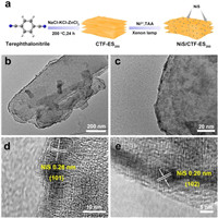 | Fig. 1. (a) Synthesis diagram of NiS/CTF-ES200 photocatalyst. TAA is a thioacetamide. (b, c) TEM images of NiS/CTF-ES200. (d, e) HRTEM images of NiS/CTF-ES200. | |