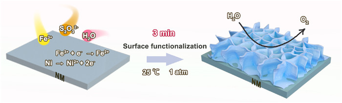 The electrode was prepared via a rapid, energy-free surface functionalization process at room temperature (25 ℃, 1 atm). Specifically, a commercially available NM was immersed in an aqueous surface functionalization solution containing sodium thiosulfate (Na2S2O3) and ferric chloride (FeCl3) for just 3 min. As illuminated in Fig. 1, the spontaneous surface reconstruction originates from a nickel-driven redox process: metallic Ni (Ni0) acts as the reducing agent to reduce Fe3+ to Fe2+ (Ni0 + 2Fe3+ → Ni2+ + 2Fe2+), while S2O32− ions accelerate this reaction by (1) complexing with Ni2+ to destabilize the Ni lattice ([Ni2+ + S2O32− → Ni(S2O3)_n]2−), and (2) serving as electron mediators to facilitate interfacial charge transfer. This synergistic dissolution-reconstruction mechanism generates hierarchical nanosheets architecture. This one-step, solution-based strategy enables large-area, scalable fabrication of OER-active electrodes without the need for external energy input, high-temperature treatment, or complex post-processing.
