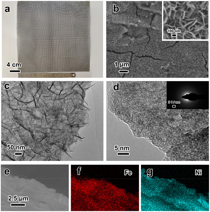 | Fig. 2. (a) Photograph, (b) SEM image (c) TEM image, (d) HRTEM image of SFN/NM electrode. (e-g) EDS elemental mapping of SFN/NM electrode. | |